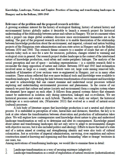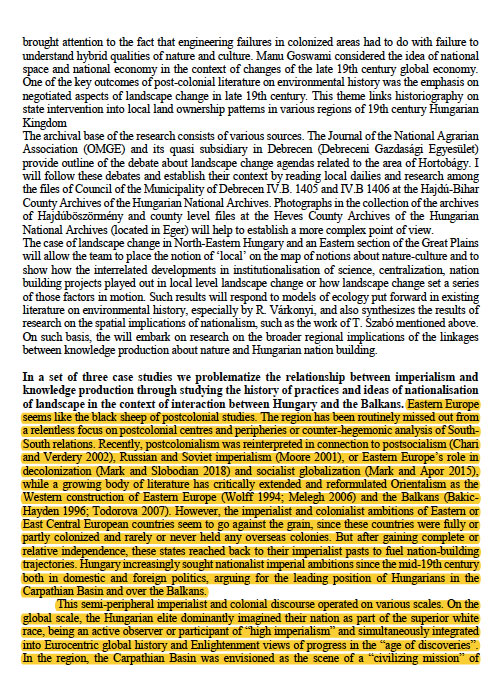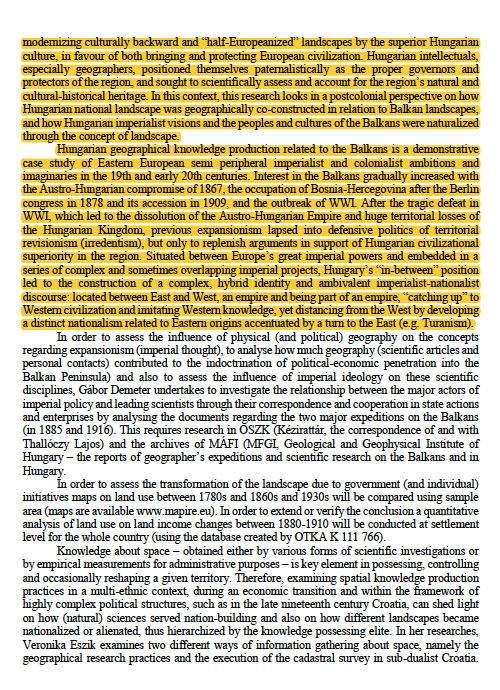 Below you can read the basic text of our research application (see .pdf); it also had other attachments and was uploaded in different parts via an official form. I was not responsible for making the final editing and uploading of the text, the latter was the responsibility of the Principal Investigator. My contribution to the research project was the application of postcolonial theory and world-systems analysis to the case study of Hungarian Balkanism in order to understand it as part of a semiperipheral trajectory within global colonialism. My empirical input was to look at geographers and geographical knowledge production in Hungarian imperialism and colonialism in the Balkans. I’ve highlighted in the text all unedited parts that have been written only by me, and represent my own academic research and intellectual property. I never allowed my intellectual contribution to be used without my permission solely for others’ financial gain at the expense of my basic rights and material interests.